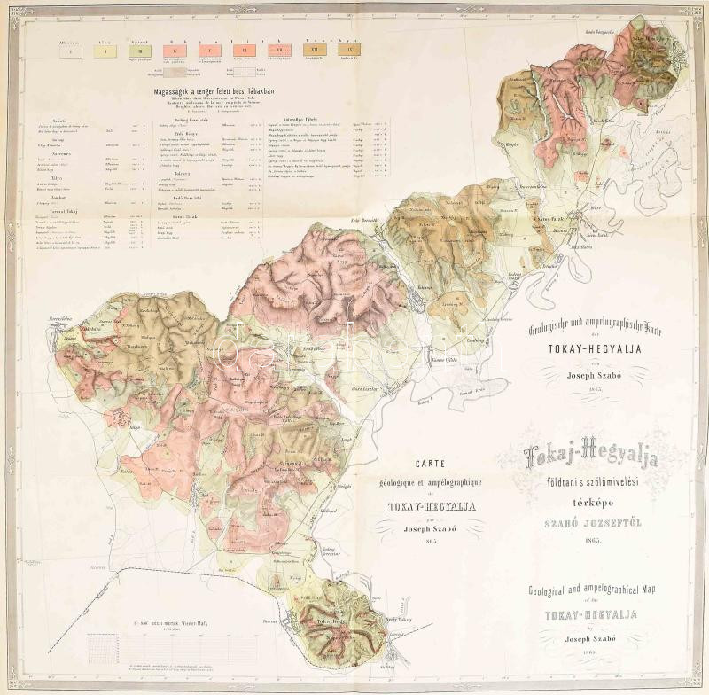 Tokaj-hegyaljai album. Kiadja a Tokaj-hegyaljai Bormívelő Egyesület és elnöke báró Vay Miklós. Szerk.: Dr. Szabó József - Török István. Pest, 1867. Emich. 1t. (kőnyomatú díszcímlap)+(6)+185+(2)p.+21t. (hártyapapírral védett kőnyomatok)+1 kihajt. térkép Négynyelvű címlappal és szöveggel. A kiadó Bormívelő Egyesület célja a borvidék megismertetése volt itthon és külföldön is, ezért négynyelvű (magyar-német-francia-angol) szöveggel adták ki az albumot. A kötet szerkesztői Szabó József egyetemi tanár és Török István helyi földbirtokos. A könyv tíz fejezetből áll, köztük földrajzi, földtani és a lakosságról szóló is olvasható benne. Emellett a jövőbeni vásárlókat meg kívánja ismertetni a terület bortermő képességével, minőségével, a tárolási és szállítási lehetőségekkel is. A vidék földtani és szőlőművelési térképét Szabó József készítette. A kötet a borvidék legrészletesebb tudományos igényű leírását adja. Keleti Gusztáv gyönyörű kőnyomatai pedig az egyik legszebb magyar díszalbummá emelik. Korabeli vászonkötésben. Foltos, gerincen kis sérülés, foltos metszetlapokkal.