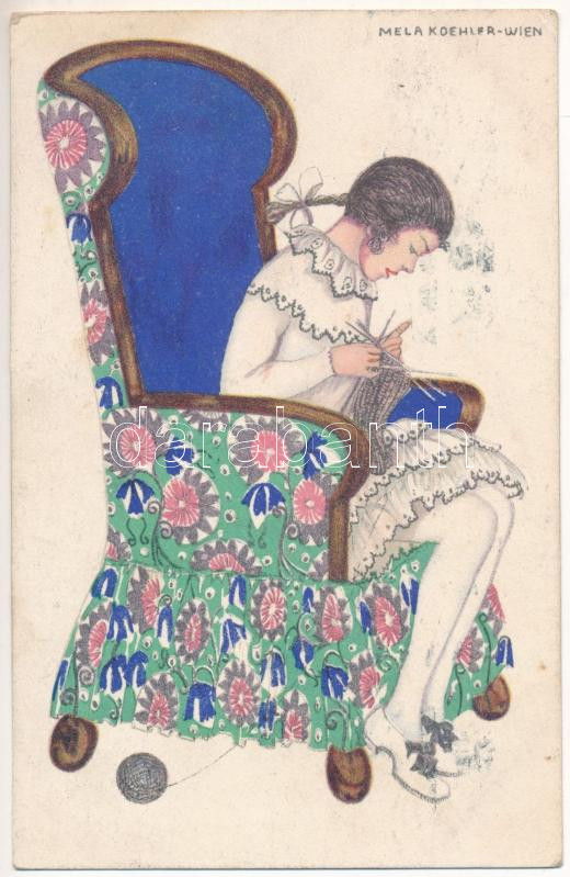 1917 Viennese Art Nouveau. Knitting lady. B.K.W.I. 364-6. s: Mela Koeh... https://www.darabanth.com/de/42-Gross-Auktion/42.1/Ansichtskarten/Kunstlerkarten~17502/1917-Viennese-Art-Nouveau-Knitting-lady-BKWI-364-6-s-Mela-Koehler-EK~II3113291