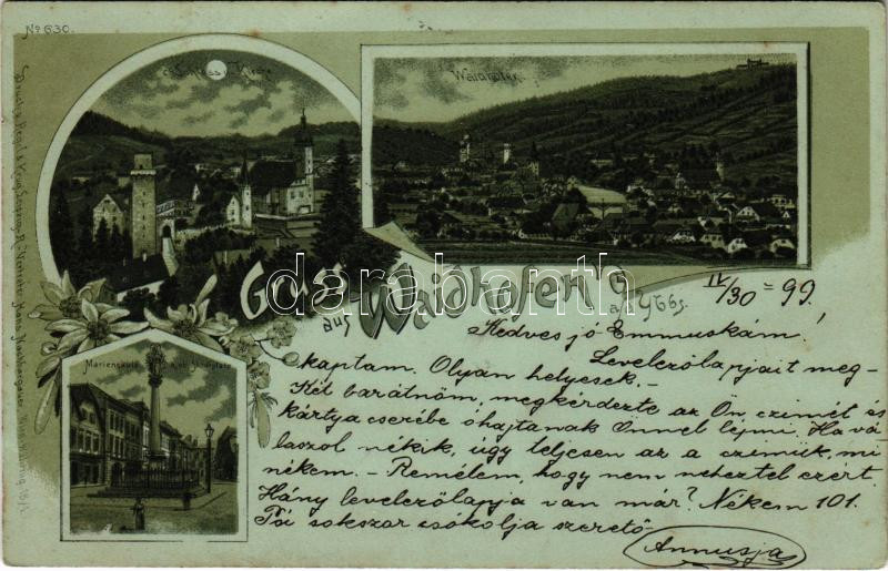 1899 (Vorläufer) Waidhofen an der Ybbs, Schloss u. Kirche, Mariensäule am ob. Stadtplatz / castle, church, general view, Mary's column, main square. Regel & Krug Art Nouveau, floral, litho (fl)