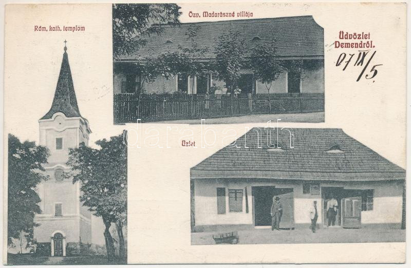 1907 Deménd, Demandice (Hont); Római katolikus templom, Özv. Madarászn... https://www.darabanth.com/de/42-Gross-Auktion/42.1/Ansichtskarten/Slowakei~17446/1907-Demend-Demandice-Hont-Romai-katolikus-templom-Ozv-Madaraszne-villaja-kastely-uzlet-~II3114497