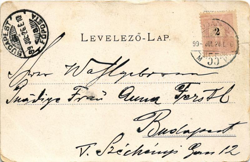 Beschreibung: 1899 (Vorläufer) Budapest XII. Zugliget, Disznófő forrás és vendéglő, étterem kertje. Divald Károly 173. (EK)