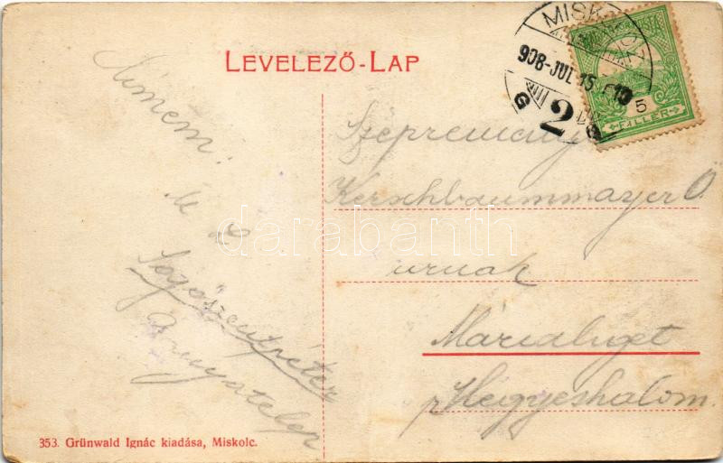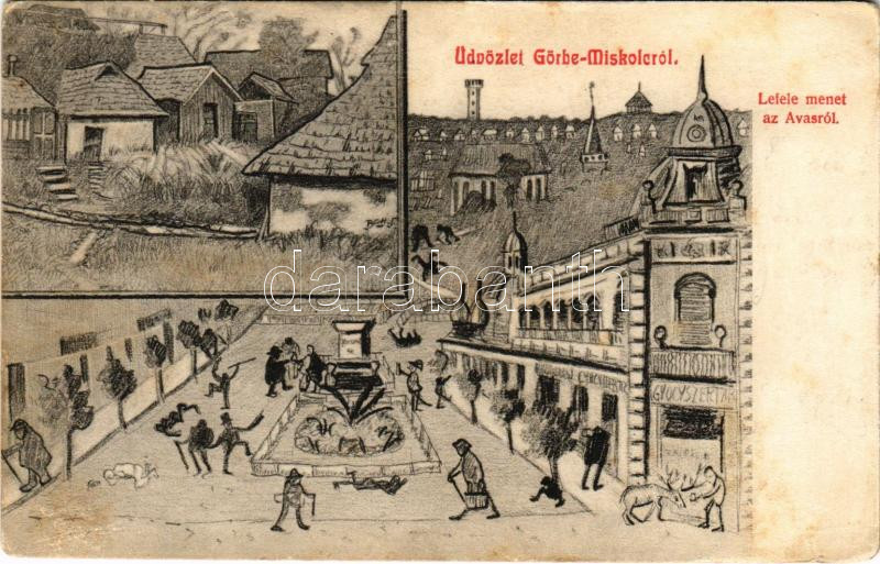 Beschreibung: 1908 Miskolc, (Görbe-Miskolc), Lefelé menet az Avasról, gyógyszertár. Grünwald Ignác kiadása - humoros rajz (fl)