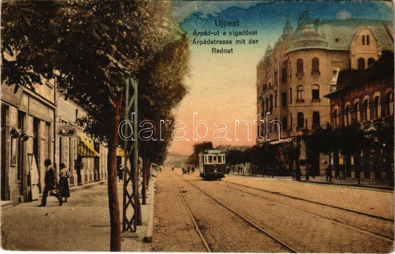 1914 Budapest IV. Újpest, Árpád út a vigadóval, üzletek, villamos (EK) https://www.darabanth.com/de/42-Gross-Auktion/42.1/Ansichtskarten/Ungarn~17443/1914-Budapest-IV-Ujpest-Arpad-ut-a-vigadoval-uzletek-villamos-EK~II3114277