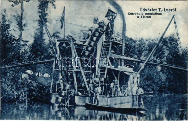 Tiszalúc (Zemplén), Kotróhajó munkában a Tiszán (r) https://www.darabanth.com/de/42-Gross-Auktion/42.1/Ansichtskarten/Ungarn~17443/Tiszaluc-Zemplen-Kotrohajo-munkaban-a-Tiszan-r~II3113422
