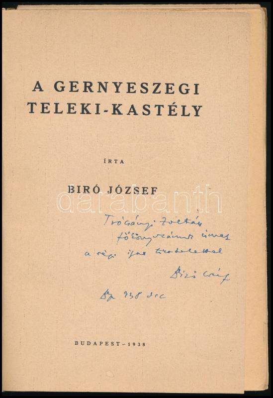 Biró József: A gernyeszegi Teleki-kastély. (DEDIKÁLT). Bp., 1938, szerzői kiadás (Sárkány-ny.), 145+(1) p. + 12 (kétoldalas) t. Első kiadás. Fekete-fehér képekkel illusztrálva. Kiadói papírkötés, részben sérült, laza fűzéssel, két kijáró képtáblával, a hátsó borítón kis foltokkal. A szerző, Biró (Bíró) József (1907-1945) művészettörténész, a nyilasterror áldozata által Trócsányi Zoltán (1886-1971) nyelvész, irodalomtörténész részére DEDIKÁLT példány.