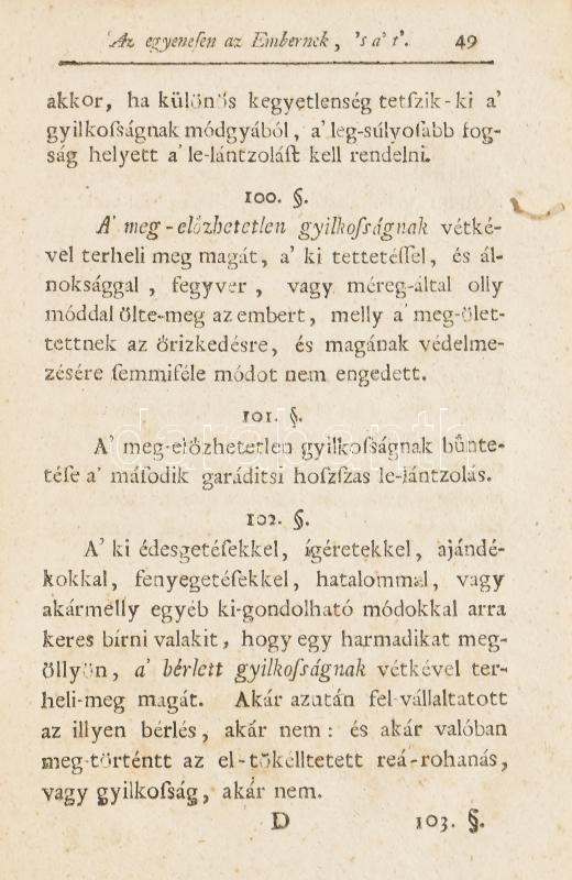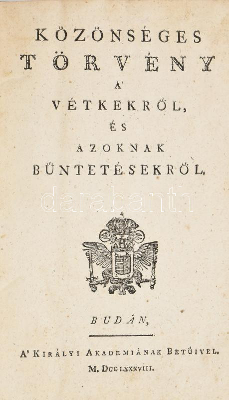Közönséges törvény a' vétkekröl, és azoknak büntetésekröl Budán, 1788, A' Királyi Akadémiának Betűivel, [6] p. + 128 p. Közönséges törvény a', vétkekröl, és azoknak büntetésekröl. Magyarországon megjelentetett első magyar hatályos büntető törvénykönyv. Korabeli kartonált papírkötésben , jó állapotban.