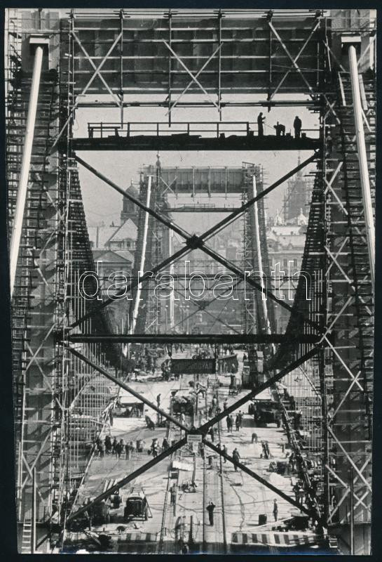 Beschreibung: cca 1964 Budapest, vintage fotó az Erzsébet híd építéséről, jelzés nélkül, ezüst zselatinos fotópapíron, 24x16,5 cm
