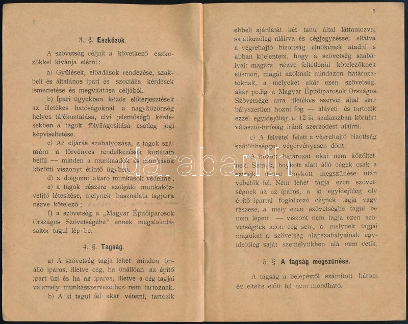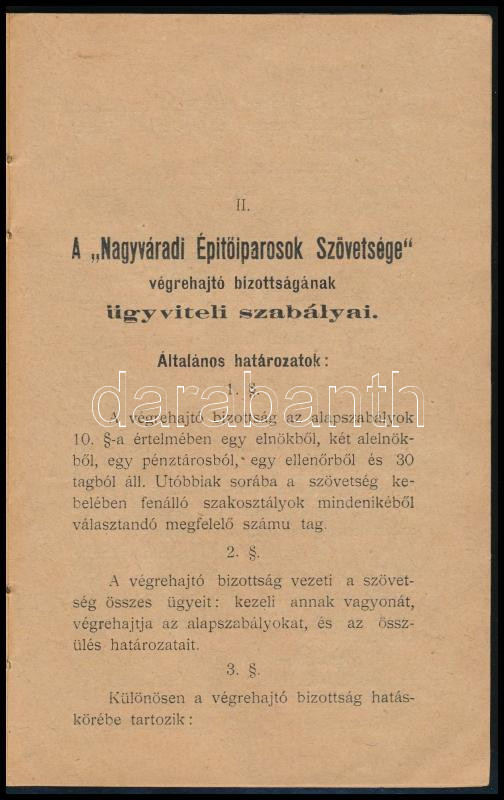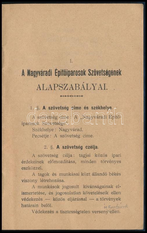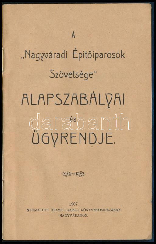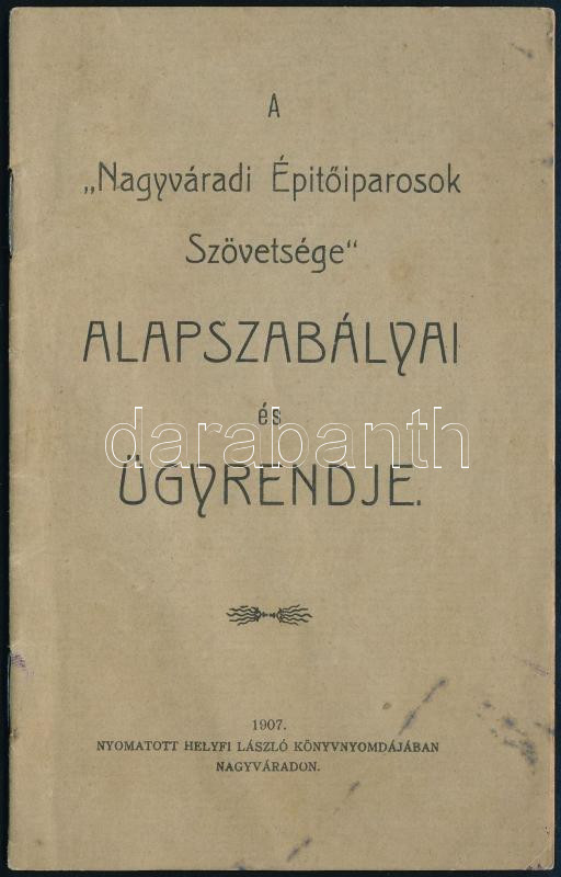 1907 A "Nagyváradi Építőiparosok Szövetsége" alapszabályai és ügyrendje. Nagyvárad, 1907., Helyfi László, 35 p. Kiadói papírkötés, kissé foltos borítóval, 16x10 cm