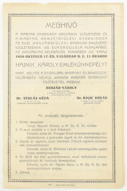 1926 Meghívó Magyar Gyorsírók Országos Szövetsége Hajnik Károly-emléün... https://www.darabanth.com/de/42-Gross-Auktion/42.1/Kunst-Skulpturen-Historische-Dokumenten-andere-Sammelgebiete/Drucksachen~17439/1926-Meghivo-Magyar-Gyorsirok-Orszagos-Szovetsege-Hajnik-Karoly-emleunepelyere~II3121410
