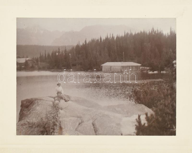 1902 Csorba-tó a Tátrában, fotó kartonon, Bp., Calderoni és Társa, a hátoldalán Hopp Ferenc (1833-1919) optikus, műgyűjtő, keletkutató és múzeumalapító, a Calderoni és Társa cég tulajdonosa autográf soraival és aláírásával, "Csorba tó 1902 Hopp Ferenc", 11x15, karton: 17x22 cm