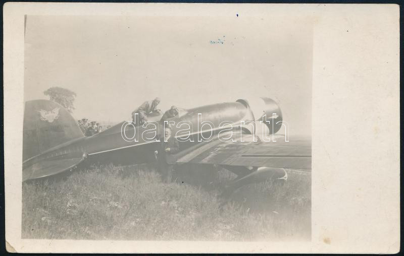 Beschreibung: 1931 Endresz György (1893-1932) és Magyar Sándor pilóták, Szalay Emillel a még át nem alakított Justice for Hungary előtt, fotólap, 9x14 cm.