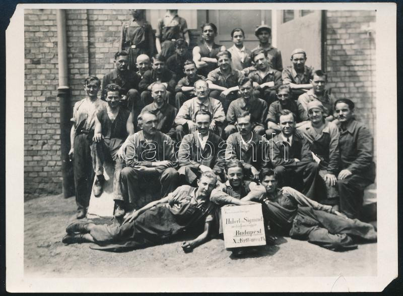 Beschreibung: 1932 Bp. X., Fertő utca 14. szám alatt működő Hubert és Sigmund Acél- és Fémárugyár munkásainak csoportképe, fotó, szélén kis szakadással, sarokhiánnyal, 12x9 cm