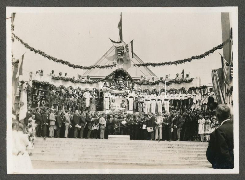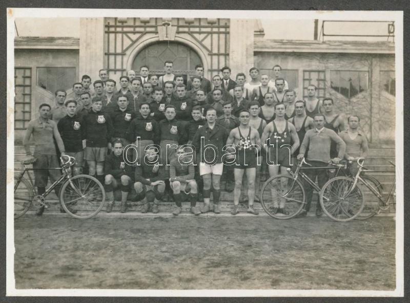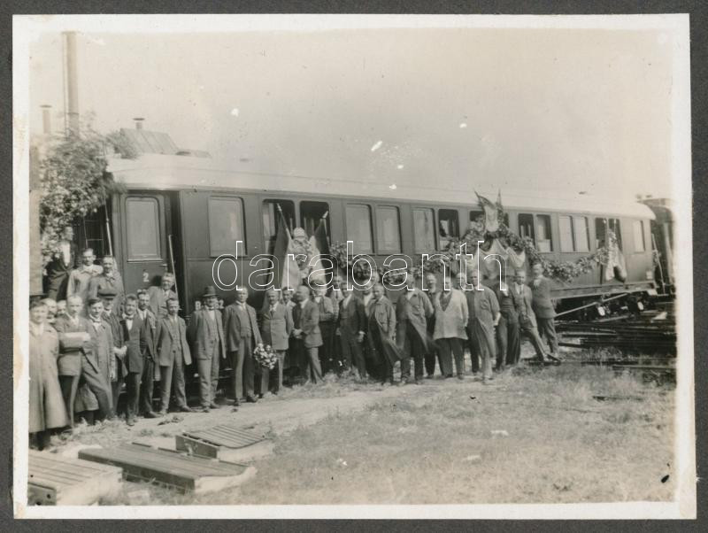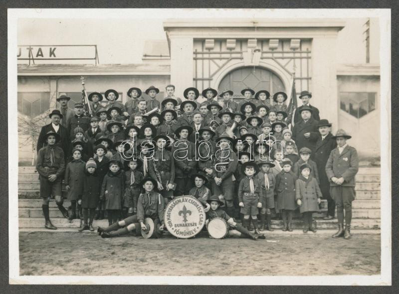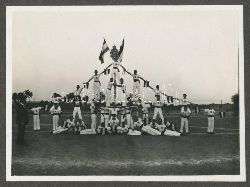 1935 Dunakeszi, Magyarság Dal és Önk. Egyesület fotóalbuma egyesületi tag részére, elnökség aláírásaival, 20 db fotóval, többek közt csoportképek (cserkész, sportolók stb.), épületek (MÁV Dunakeszi Főműhely, színház stb.), enteriőrök, vasút, mozdony. 8,5x11,5 cm. Albumlapokra ragasztva, hártyapapírral védve, korabeli egészvászon kötésben. Jó állapotban. Érdekes, egyedi összeállítás!