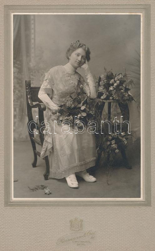 cca 1913 Ohio, Cincinnati, Reimann fényképész műtermében készült, keményhátú vintage fotó, feliratozva a hátoldalon, Betty Schültz vélhetően Magyarországról vándorolt ki, s onnan küldte haza ezt a fényképet, további kutatásra érdemes lelet, 23x15,5 cm