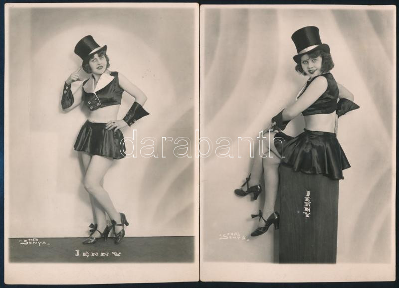 Beschreibung: cca 1930 Jenny revütáncosnő, 2 db Sonya fotó, hátoldalon albumba ragasztás nyomával, 16×11,5 cm