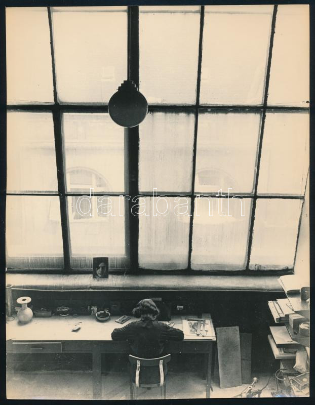 cca 1933 Seiden Gusztáv (1900-1992) budapesti fotóművész (később Londonban élt, de ott már nem fotografált) ,,Műteremben" című felvétele, 1 db vintage fotó, későbbi nagyítás, jelzés nélkül, ezüst zselatinos fotópapíron, a róla szóló könyv egyik illusztrációja volt; a képet jegyzi a Szilágyi Gábor féle ,,Fotóművészeti kiállítások szakrepertóriuma", 24x18 cm