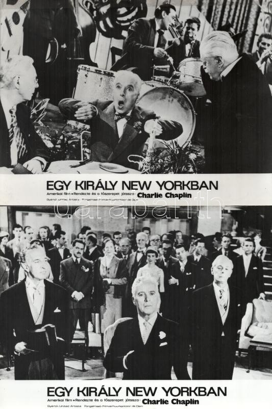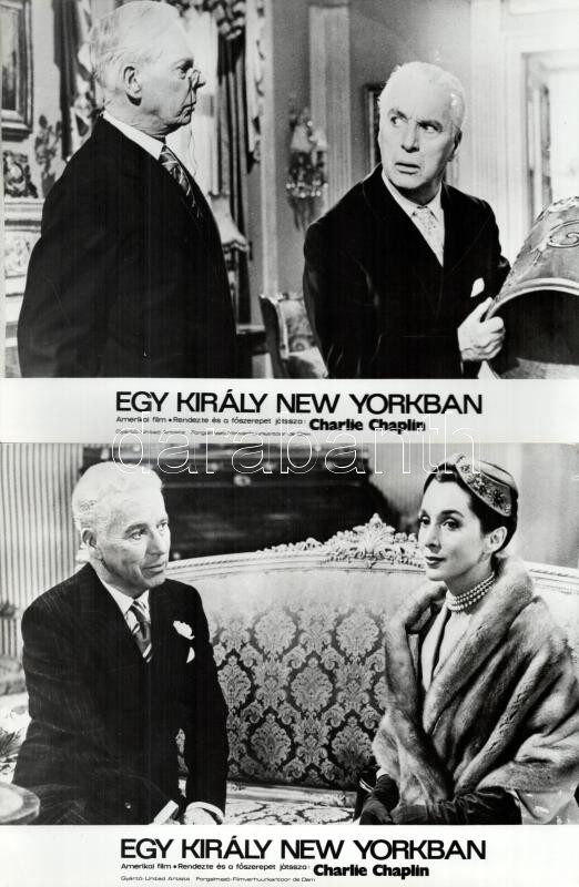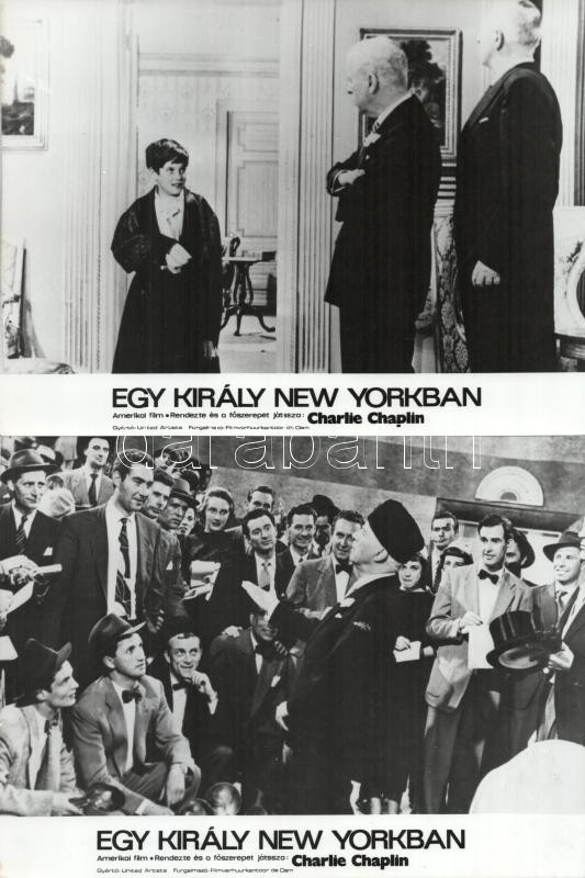 cca 1957 ,,Egy király New Yorkban" című amerikai film jelenetei és szereplői (főszereplő Charlie Chaplin, de egyben a film rendezője is), 19 db vintage produkciós filmfotó (vitrinfotó, lobbyfotó) ezüst zselatinos fotópapíron, a használatból eredő (esetleges) kisebb hibákkal, 18x24 cm