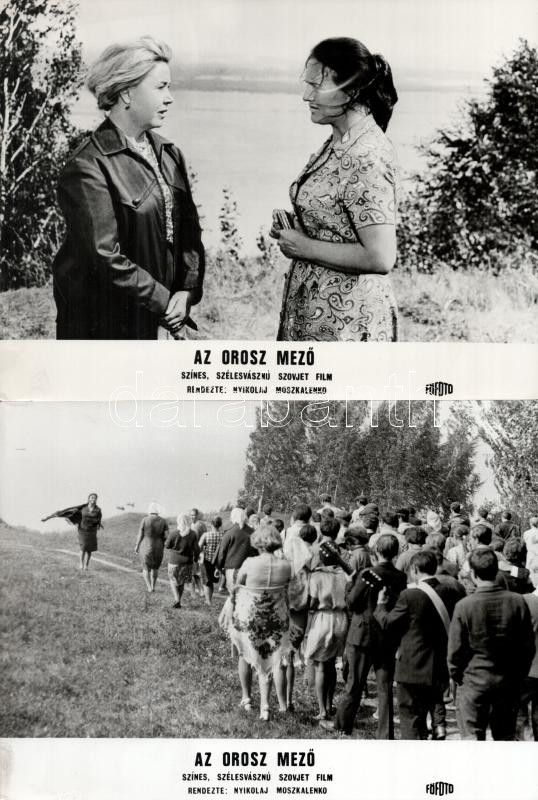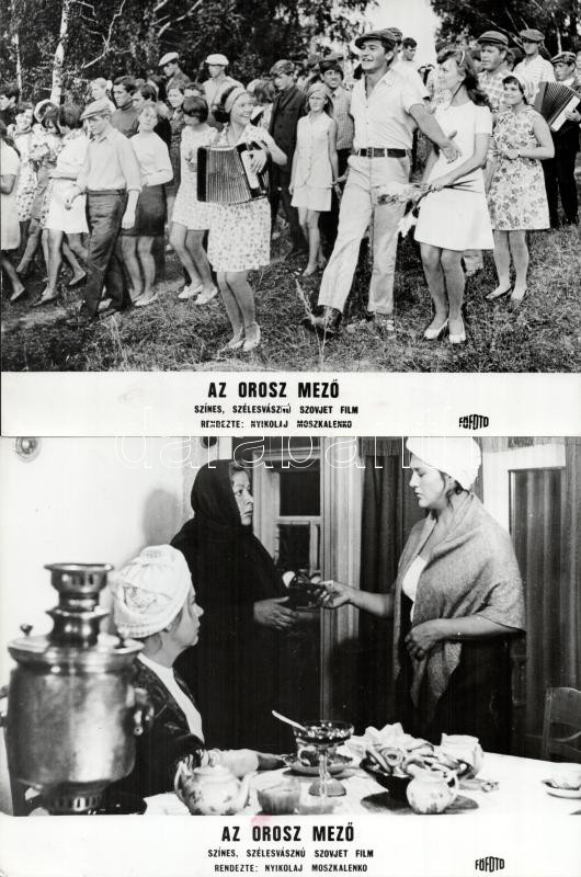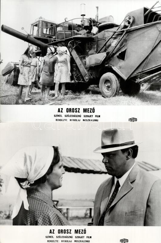 cca 1989 előtt készült ,,Az orosz mező" című szovjet film jelenetei és szereplői, 16 db vintage produkciós filmfotó (vitrinfotó, lobbyfotó) ezüst zselatinos fotópapíron, a használatból eredő (esetleges) kisebb hibákkal, 18x24 cm