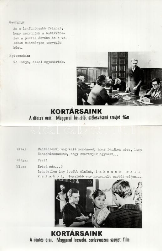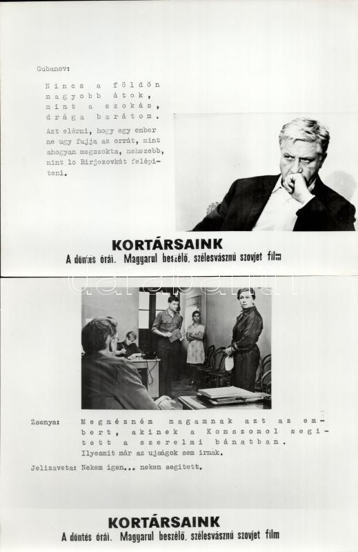 cca 1989 előtt készült ,,Kortársaink" című szovjet film jelenetei és szereplői, 13 db vintage produkciós filmfotó (vitrinfotó, lobbyfotó) ezüst zselatinos fotópapíron, a használatból eredő (esetleges) kisebb hibákkal, a forgatókönyvből kiemelt, magyarra fordított idézetekkel, 18x24 cm