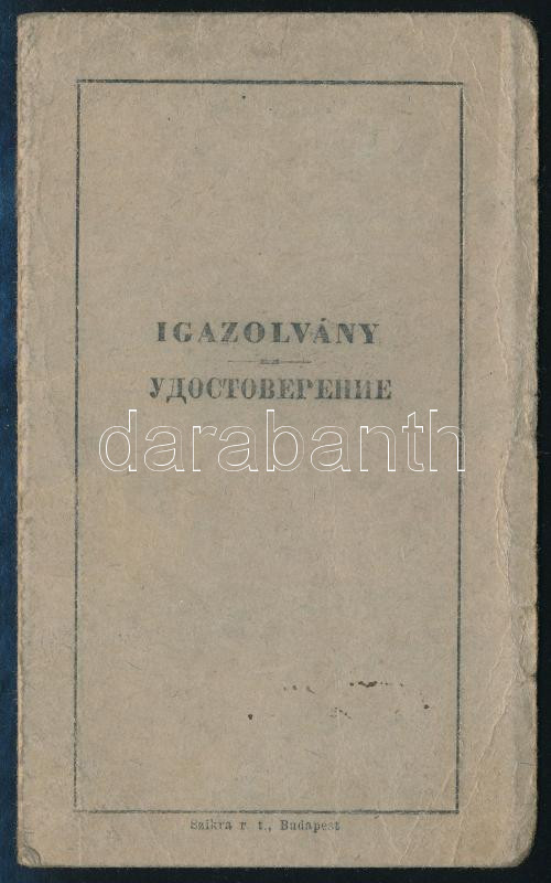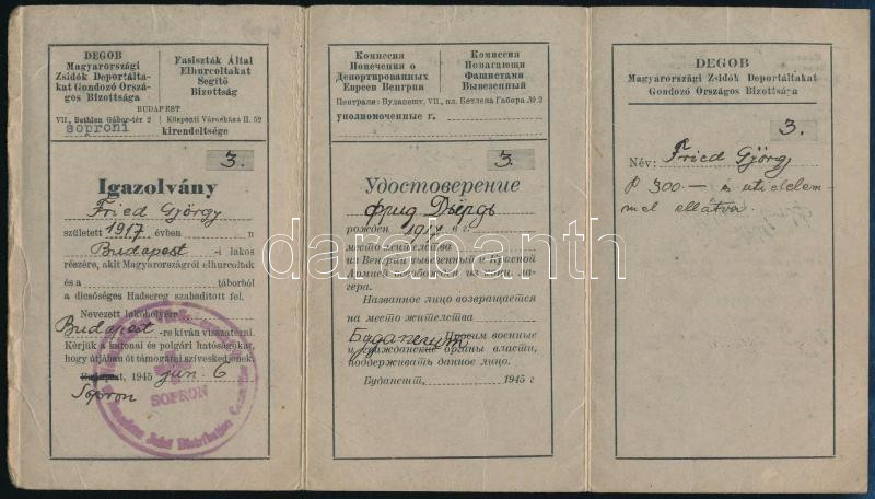 Beschreibung: 1945 Sopron, DEGOB - Magyarországi Zsidók Deportáltakat Gondozó Országos Bizottsága orosz-magyar nyelvű igazolvány