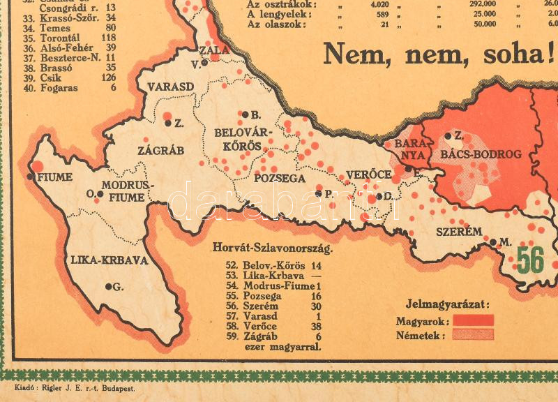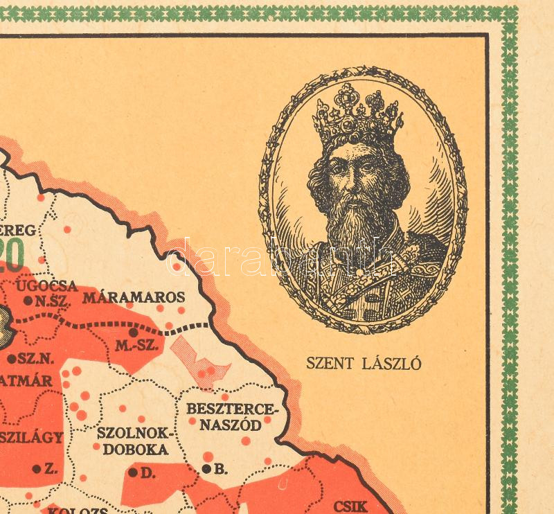 Magyarország térképe az elszakított területekkel. Propaganda térkép, kartonlapra nyomtatva. A térkép körül statisztikai adatok a trianoni veszteségekkel (területi, lakosság számaránya, ill. nemzetiségi megoszlása szerint) A kép jobb felső sarkában Szent László király.