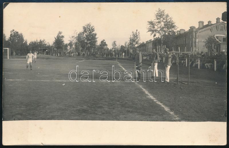 1919 Krasznaja Recska, Rjecska, Krasnaia- Rjetschka (Vladivostok); az ekkor már amerikai fennhatóság alatt álló tábor új focipályájának megnyitója, Réder Nándor tüzér őrnagynak, a hadifoglyok rangban legidősebb tisztjének kezdő rúgása. Fotólap 14x9 cm Hátoldalán Stobbe Kálmán (1883-1936) építőmester, labdarúgó, a magyar válogatott edzője pecsétjével / Opering of the new foootball field in the Japanese-Russian POW (prisoner of war) camp. photo