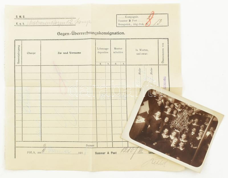 cca 1915 Karácsony a hadihajón. Osztrák-magyar tengerészek egy hajón fotó 12x9 cm + Ellenszámlás küldemény a haditengerészet polai börtönébe. Úgy tűnik, hogy nem postázták, hanem kézzel kézbesítették, mivel nincs rajta postai jelzés. Belül a börtön pecsétje: / B A large group of sailors, including an officer, pose for the camera next to a Christmas tree, most likely in an older ship. lack-and-white photo 12x9 cm + Gegen-überrechnungskonsignation sent to the Navy prison in Pola. It does not appear to have been mailed but hand-delivered as it has no postal markings. Inside, there is the prison's seal: K.u.K. MARINE-GEFANGENHAUS POLA