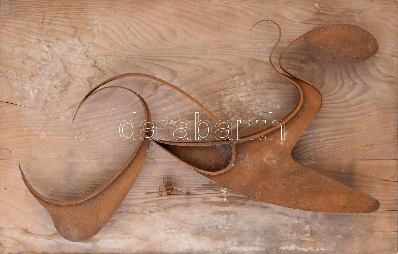 Beschreibung: Bátai István Mózes: Objet trouvé kompozíció (cím nélkül). Formált és alakra vágott vasformák, fatáblára applikálva. Jelezve balra fent: "I. Mozés". Fatáblán sérüléssel, 45,5x70 cm