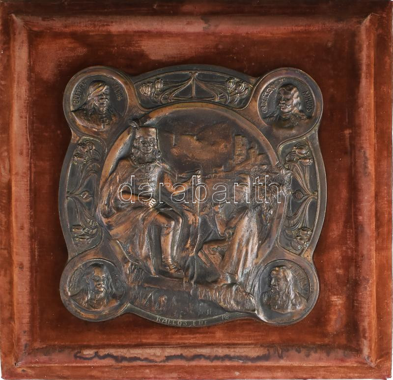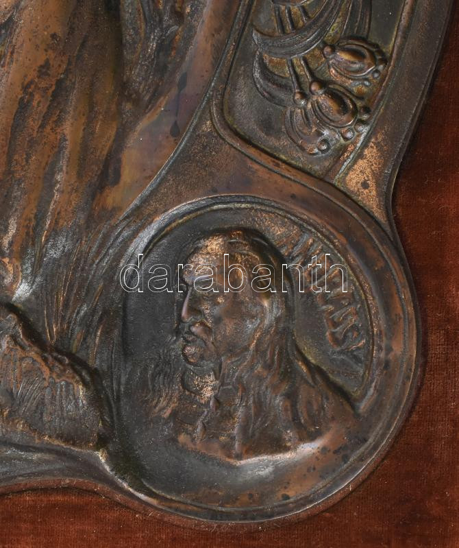 Kallós Ede (1866-1950): II. Rákóczi Ferencet ábrázoló szecessziós dombormű / relief, 1900-as évek eleje. Festett öntöttvas, bársonybevonatú keretre applikálva, bársony foltos. 33x32 cm, teljes méret 50x50 cm
