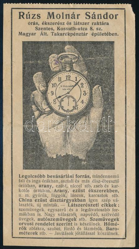 Rúzs Molnár Sándor órás, ékszerész, Szentes számolócédula, hajtásnyomm... https://www.darabanth.com/de/42-Gross-Auktion/42.1/Kunst-Skulpturen-Historische-Dokumenten-andere-Sammelgebiete/Werbungen~17242/Ruzs-Molnar-Sandor-oras-ekszeresz-Szentes-szamolocedula-hajtasnyommal~II3121391