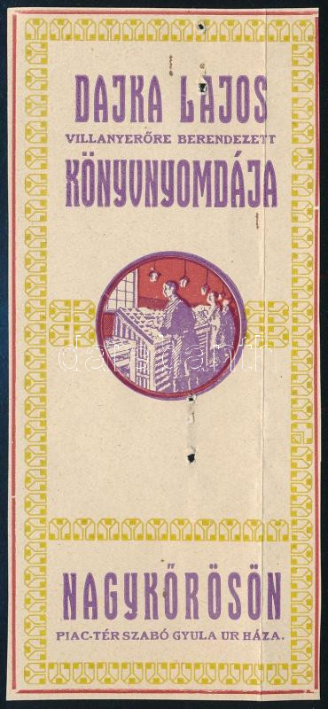 cca 1910 Nagykőrös, Piactér, Dajka Lajos könyvnyomdája számolócédula, ... https://www.darabanth.com/de/42-Gross-Auktion/42.1/Kunst-Skulpturen-Historische-Dokumenten-andere-Sammelgebiete/Werbungen~17242/cca-1910-Nagykoros-Piacter-Dajka-Lajos-konyvnyomdaja-szamolocedula-lyukasztas-nyomaval-~II3121364