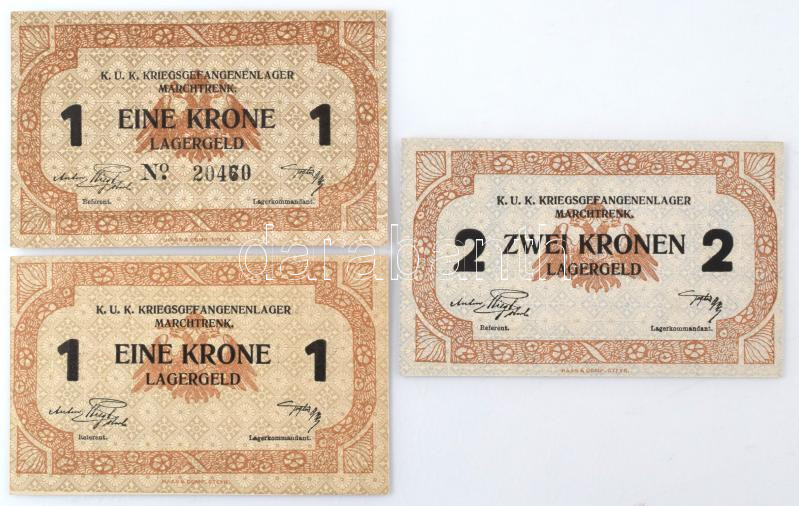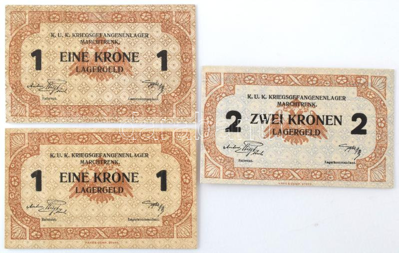 Beschreibung: Ausztria / Marchtrenk hadifogolytábor ~1916. 1K sorszámozott változat "20460", hullámos papír (nedvességet kapott?), ragasztónyom + 1K + 2K T:AU Austria / Marchtrenk POW camp ~1916. 1 Corona + 1 Corona with serial number "20460" wavy paper (wet damage?), gluemark + 1 Corona + 2 Corona C:AU