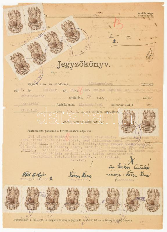 1945 Jegyzőkönyv 46.000P illetékkel / Police record with fiscal stamps https://www.darabanth.com/de/42-Gross-Auktion/42.1/Philatelie-und-Postgeschichte-Ausland/Stempelmarken~17236/1945-Jegyzokonyv-46000P-illetekkel-Police-record-with-fiscal-stamps~II3119111