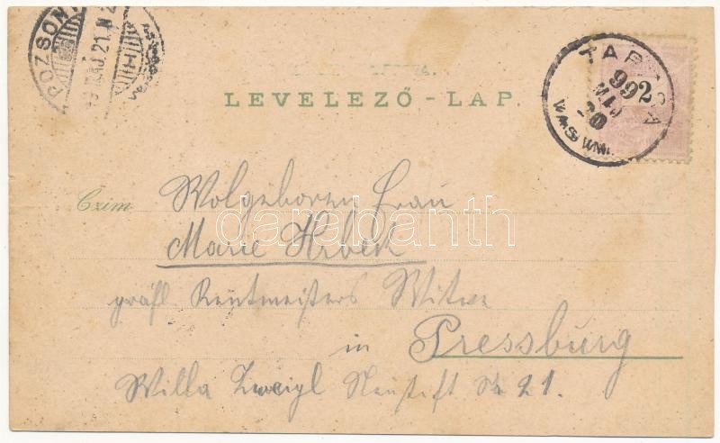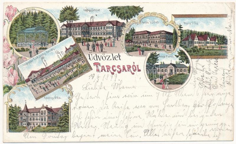 1899 (Vorläufer) Tarcsa, Tatzmannsdorf; Miksa-forrás, Gyógytér és Károly-forrás, Gyógyudvar, Forrás épület, Mária villa, Karolina villa, Anna fürdő / spa, bath, spring sources, hotel, villas. Art Nouveau, floral, litho (szakadás / tear)