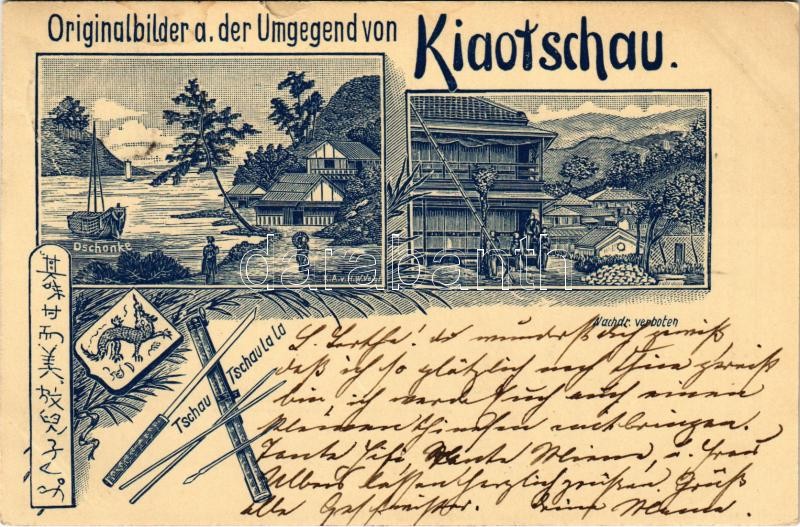 1898 (Vorläufer!) Qingdao, Tsingtau, Kiautschou Bay concession; Originalbilder a. der Umgegend von Kiaotschau. Dschonke, Tschau Tschau La La. Art Nouveau, floral (small tear)