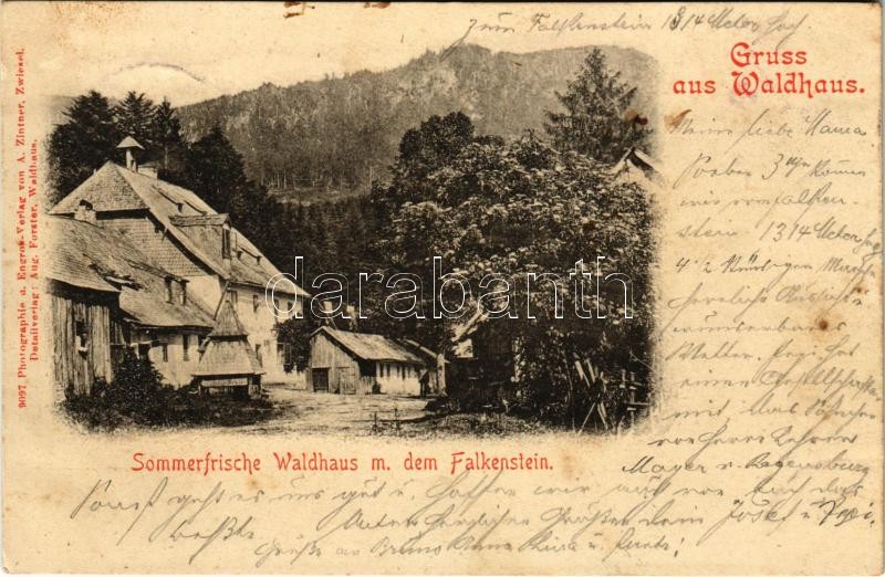 1900 Waldhaus mit dem Falkenstein (Bayerischer Wald) (fl) https://www.darabanth.com/de/420-Fernauktion/420.0/Ansichtskarten/Deutschland~1000105/1900-Waldhaus-mit-dem-Falkenstein-Bayerischer-Wald-fl~II2660874