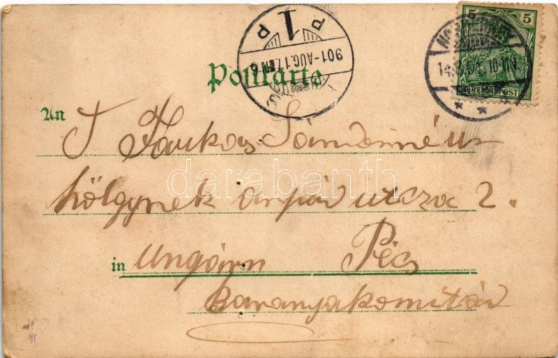 Beschreibung: 1901 Norderney, Grüsse aus Norderney. Giftbude / beach, ladies in sailboat. Kunstanstalt Rosenblatt. Art Nouveau, litho (pinholes)