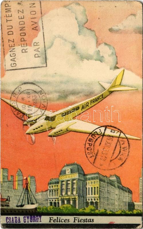 1933 Buenos Aires. Felices Fiestas! Air France Argentina (EK) https://www.darabanth.com/de/420-Fernauktion/420.0/Ansichtskarten/Flugwesen~1000048/1933-Buenos-Aires-Felices-Fiestas-Air-France-Argentina-EK~II2662299