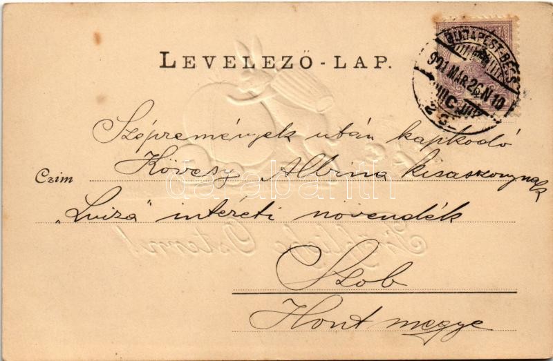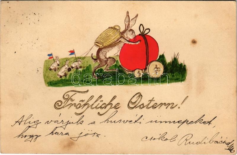 Beschreibung: 1901 Fröhliche Ostern! / Easter greeting art postcard with rabbits and egg. Emb. litho (fl)