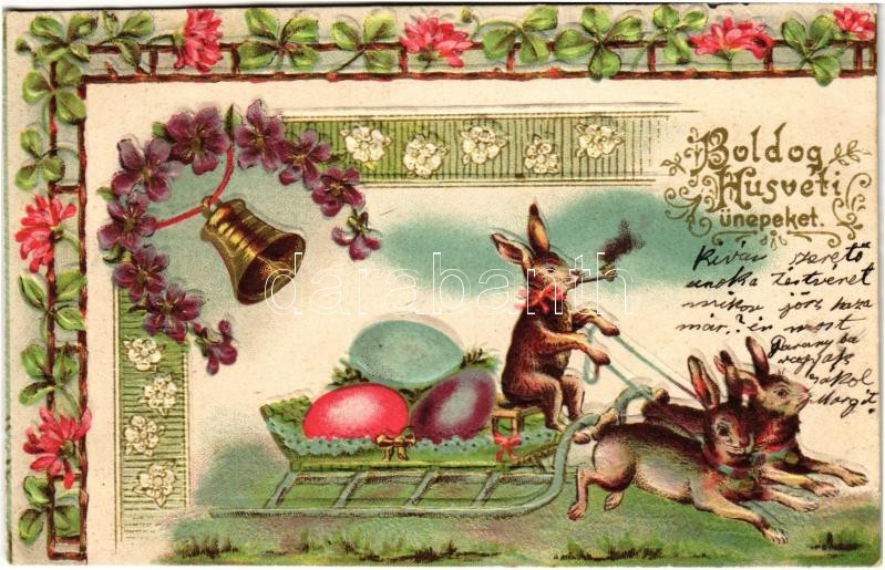 1902 Boldog húsvéti ünnepeket! / Easter greeting art postcard with rab... https://www.darabanth.com/de/420-Fernauktion/420.0/Ansichtskarten/GruC39Fkarten-Feste~1000056/1902-Boldog-husveti-unnepeket-Easter-greeting-art-postcard-with-rabbits-eggs-and-sled-Art-No~II2660082