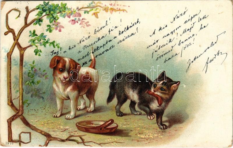 1900 Cat and dog with sausage. Floral, litho (EK) https://www.darabanth.com/de/420-Fernauktion/420.0/Ansichtskarten/Katzen~1000041/1900-Cat-and-dog-with-sausage-Floral-litho-EK~II2638735
