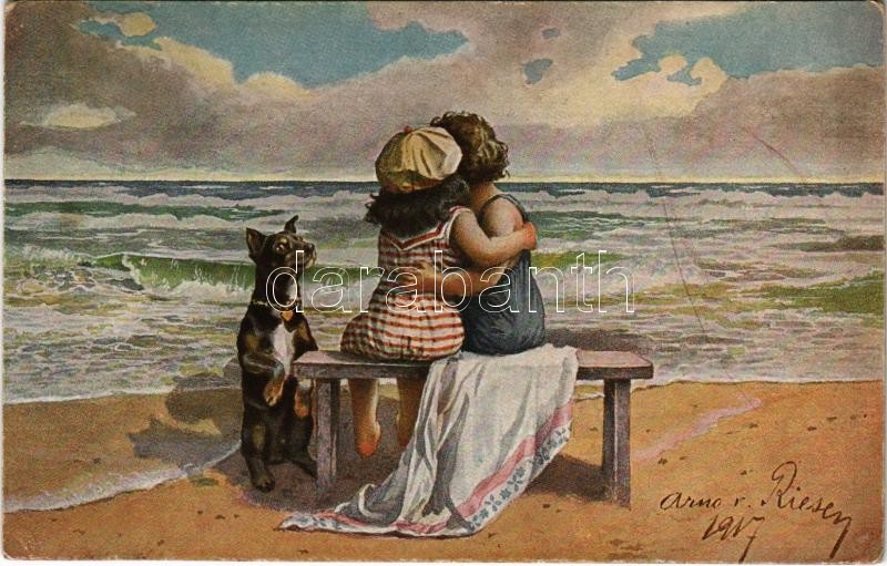Beschreibung: 1918 Weltvergessen / Children art postcard, on the beach, dog s: Arno v. Riesen (EK)