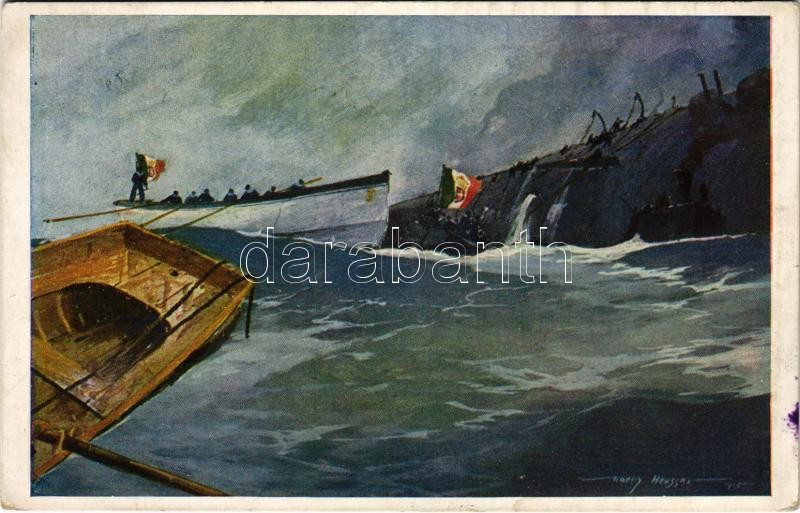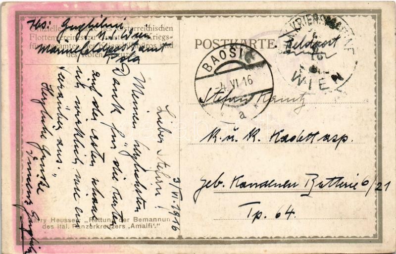Beschreibung: 1916 Rettung der Bemannung des ital. Panzerkreuzers "Amalfi". K.u.K. Kriegsmarine / WWI Austro-Hungarian Navy, Italian Armored cruiser. Offizielle Karte für Rotes Kreuz, Kriegsfürsorgeamt, Kriegshilfsbureau. Österreichischen Flottenverein s: Harry Heusser + "K.U.K. KRIEGSMARINE SMS WIEN" (fl)