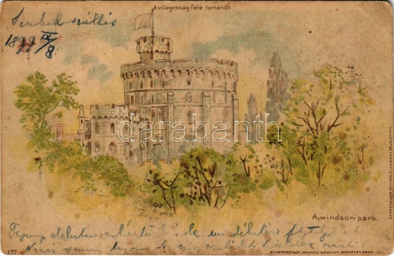1899 (Vorläufer) A windsori kastély és park. Világosság felé tartandó ... https://www.darabanth.com/de/420-Fernauktion/420.0/Ansichtskarten/Kunstlerkarten~1000042/1899-Vorlaufer-A-windsori-kastely-es-park-Vilagossag-fele-tartando-Windsor-Castle-park~II2657193