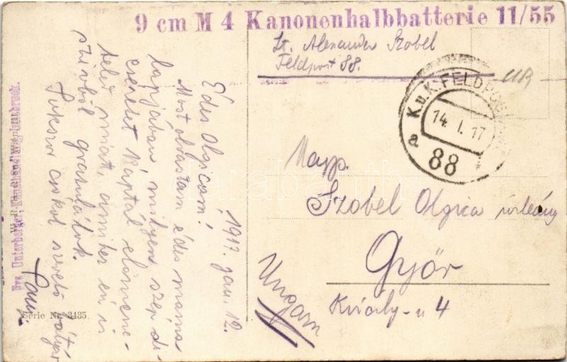 1917 WWI Austro-Hungarian K.u.K. military art postcard. W.R.B. & Co. Wien Serie Nr. 3435. s: K. Hayd + "9 cm M 4 Kanonenhalbbatterie 11/55" "K.U.K. FELDPOSTAMT 88"