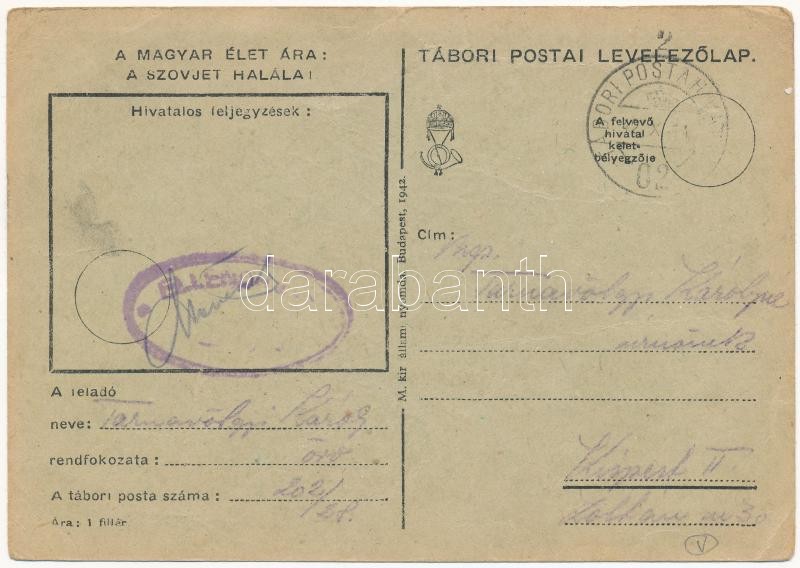 1942 Kézzel rajzolt Tábori Postai Levelezőlap az orosz frontról. "A magyar élet ára: a szovjet halála!" / WWII Hungarian military, hand-drawn field art postcard from the Russian front (fa)