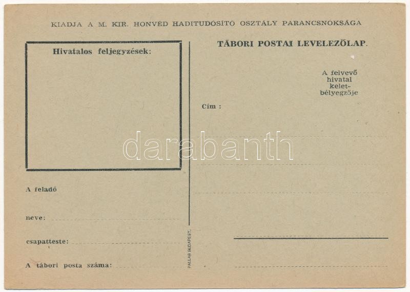 Tábori Postai Levelezőlap. Kiadja a M. kir. Honvéd haditudósító osztál... https://www.darabanth.com/de/420-Fernauktion/420.0/Ansichtskarten/Militaria~1000036/Tabori-Postai-Levelezolap-Kiadja-a-M-kir-Honved-haditudosito-osztaly-parancsnoksaga-WWI~II2658412