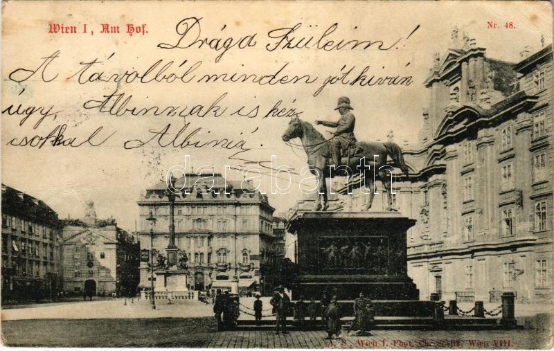1899 (Vorläufer) Wien, Vienna, Bécs; Am Hof. Phot. Ch. Scolik (fa) https://www.darabanth.com/de/420-Fernauktion/420.0/Ansichtskarten/Osterreich~1000066/1899-Vorlaufer-Wien-Vienna-Becs-Am-Hof-Phot-Ch-Scolik-fa~II2638046