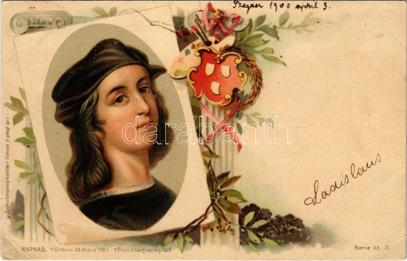 1900 Raphael Urbino / Raffaello Sanzio da Urbino. Italian Renaissance painter and architect. Lith. Druck u. Verlag v. Wezel & Naumann. Art Nouveau, floral, litho (EK)