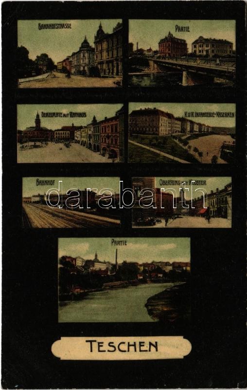 Cieszyn, Teschen; Bahnhofstrasse, Partie, Demelplatz mit Rathaus, K.u.K. Infanterie-Kasernen, Bahnhof, Oberring mit Kloster / Railway Street, bridge, square, town hall, K.u.K. infantry barracks, railway station, street view, church (EK)